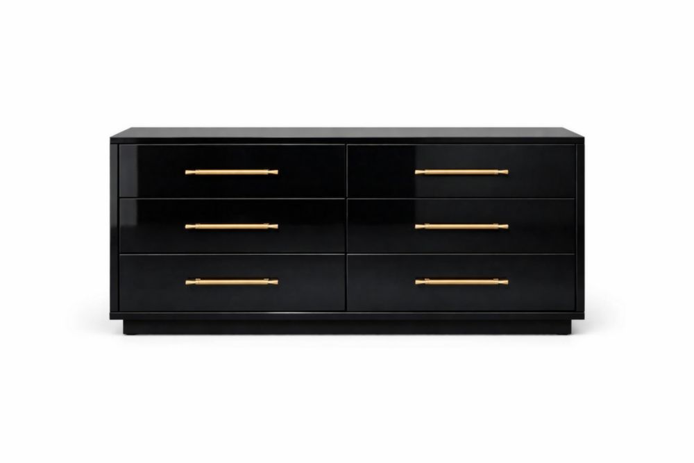Cassettiera in legno massello nero con maniglie in ottone dorato