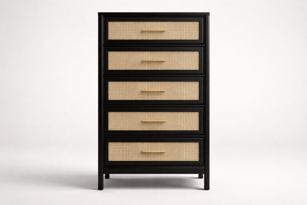 Cassettiera in legno MDF e rattan nero 5 cassetti