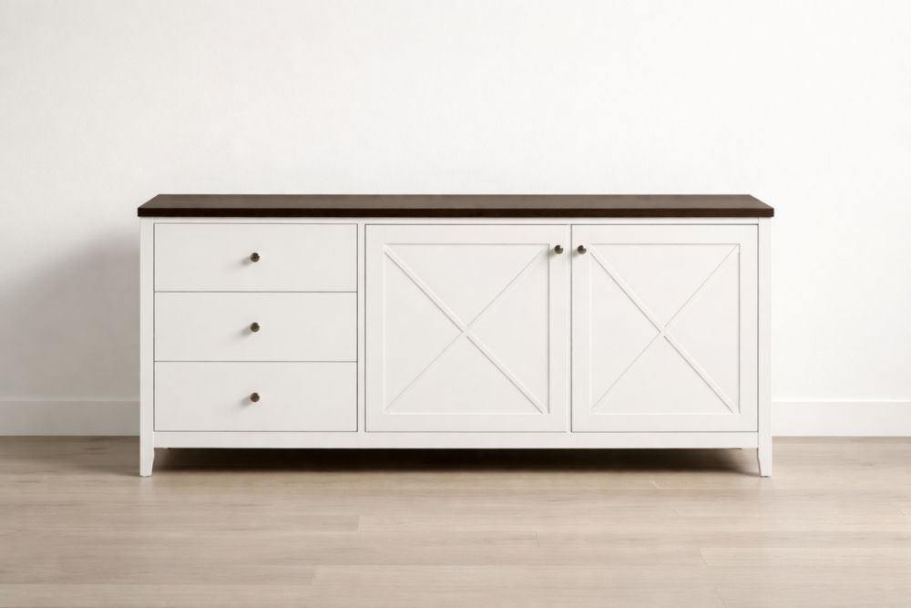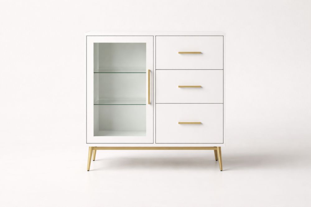 Credenza bianca con ante in vetro temperato e 3 cassetti