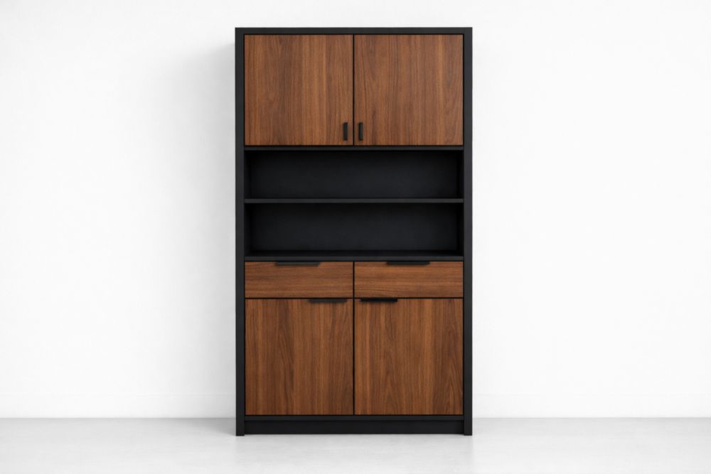 Mobile Credenza Alta da Sala da Pranzo in Legno di Noce e Metallo con Quattro Ante e Mensole