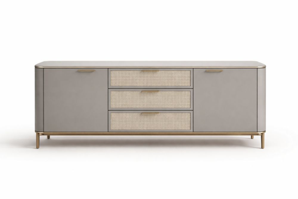 Credenza Rettangolare Grigia in Legno e Rattan con Cassetti e Ante