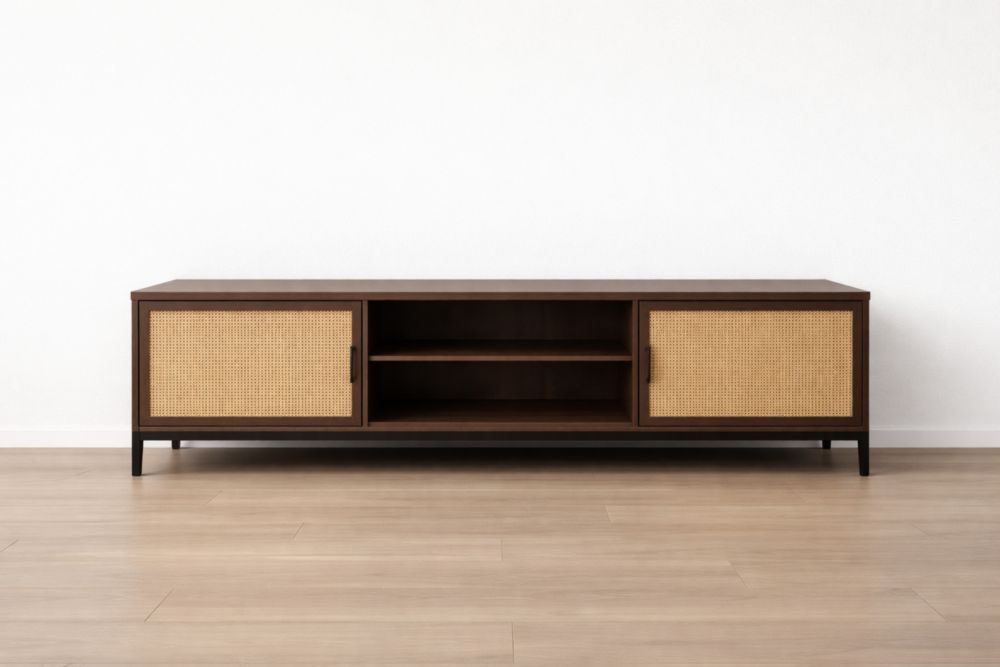 Mobile TV in legno massiccio e rattan con struttura in metallo 152x40x45 cm(Lu x L x H)
