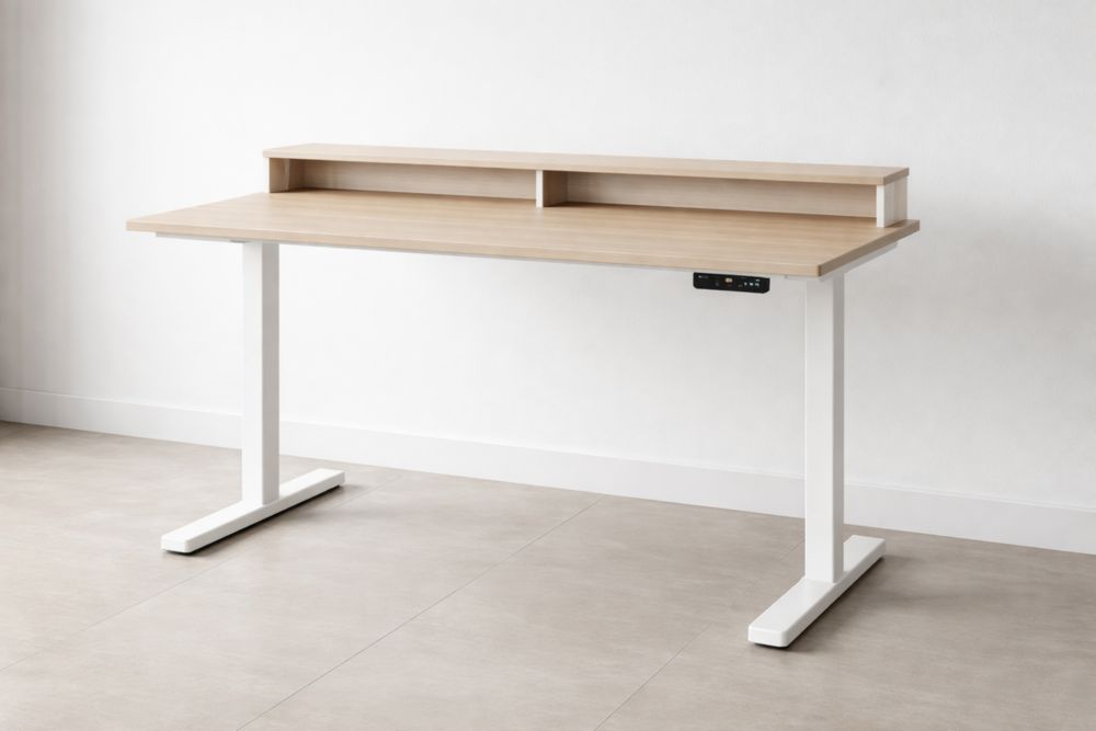 Scrivania regolabile in legno MDF chiaro e acciaio bianco