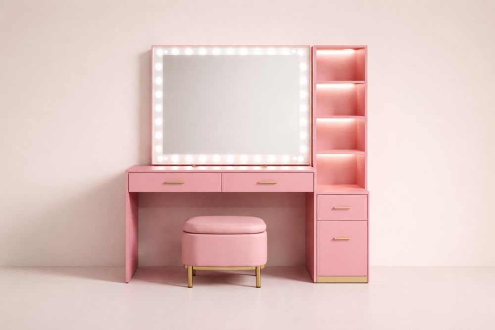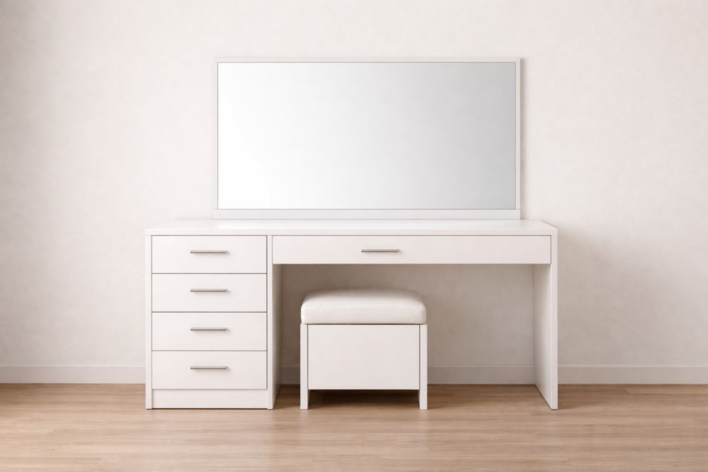 Toeletta in Legno Bianco con Specchio e Sgabello Imbottito
