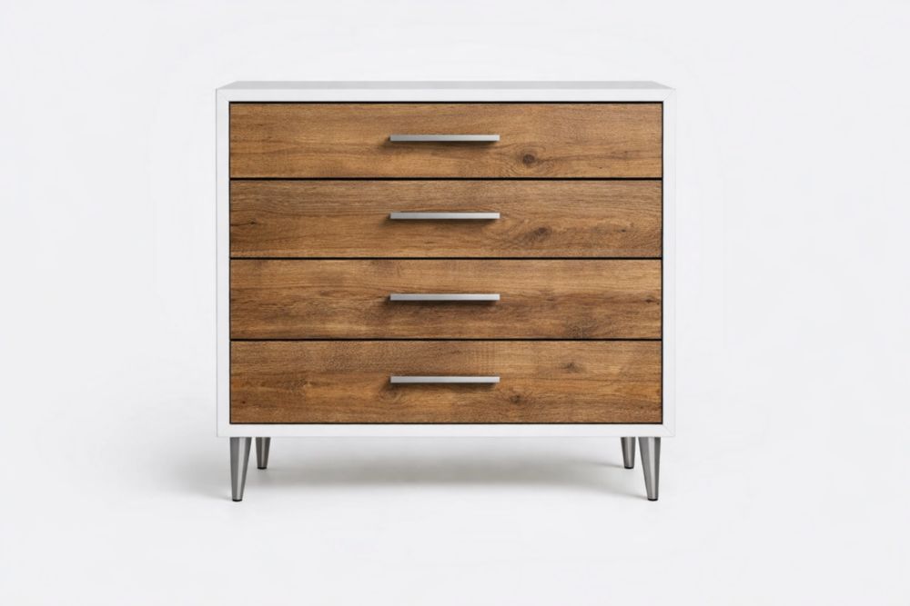 Materiale: Cassetti in legno di noce, struttura in MDF laccato bianco, maniglie in acciaio.