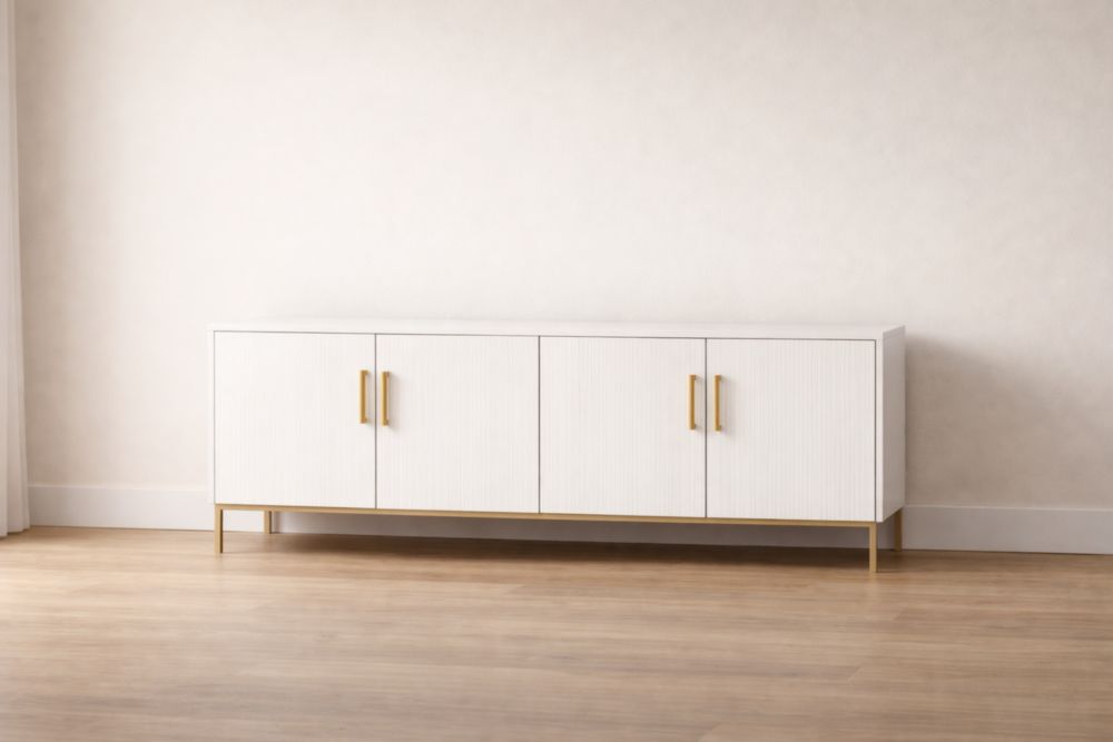Mobiletto da soggiorno con struttura in MDF e superficie verniciata. Le maniglie sono realizzate in acciaio. Le dimensioni sono 150 cm di lunghezza, 40 cm di larghezza e 60 cm di altezza. Colore principale Bianco.