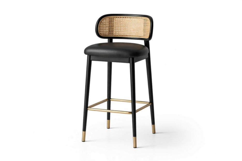 Sgabello Alto in Acciaio Nero con Schienale in Rattan e Seduta PU
