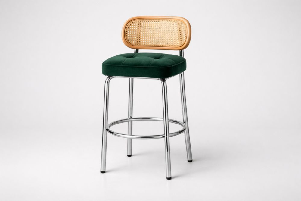 Sgabello da Bar Verde in Velluto con Schienale in Rattan e Struttura in Acciaio