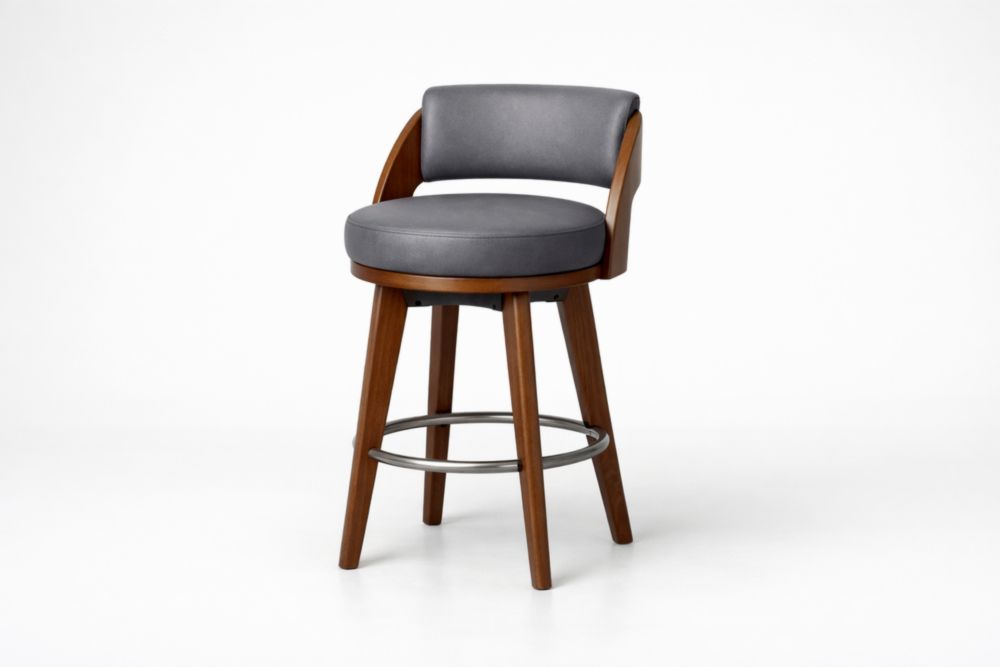 Sgabello girevole in legno massello e similpelle grigia con poggiapiedi