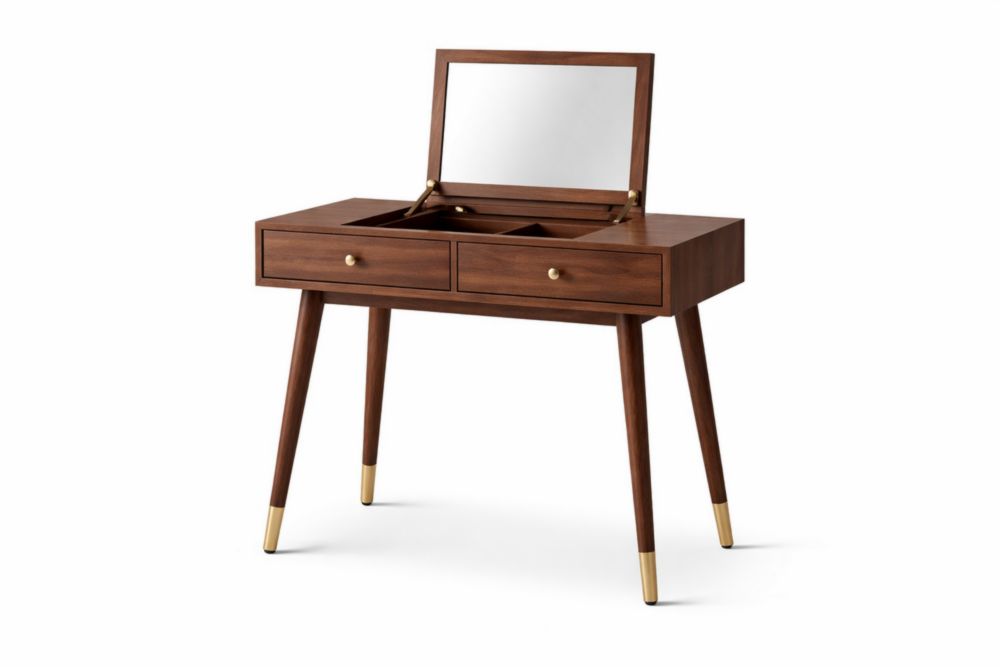 Tavolo da trucco in legno di noce massello e acciaio con specchio